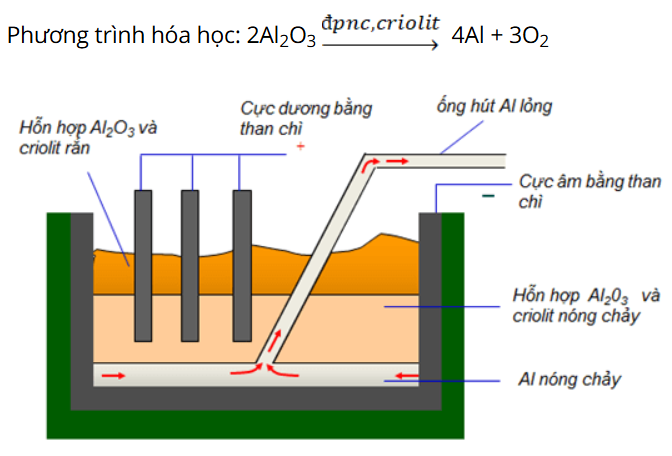 - Quặng boxit sau khi được làm sạch tạp chất, sau đó điện phân nóng chảy hỗn hợp Al2O3 và criolit (chất làm giảm to nóng chảy của Al) trong bể điện phân.