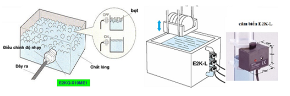+ Cảm biến tiệm cận loại điện dung có thể phát hiện mức chất lỏng trong bồn chứa, ngay cả khi có bọt. Một ví dụ điển hình là cảm biến Omron E2K-L với nút điều chỉnh độ nhạy, giúp triệt tiêu tác động của bọt khí.