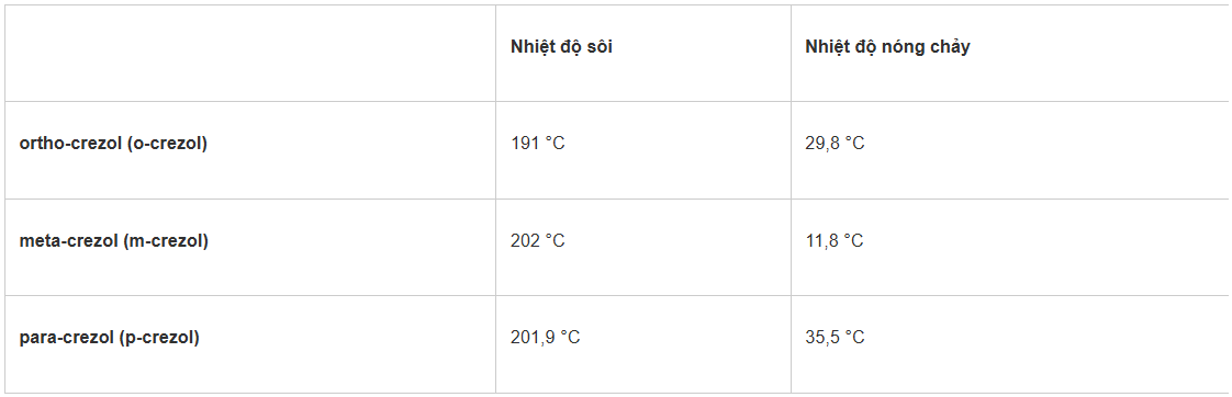 - Một phân tử crezol sẽ có 1 nhóm metyl thế vào vòng của phenol. Crezol có 3 dạng là: ortho-crezol (o-crezol), para-crezol (p-crezol) và meta-crezol (m-crezol).
