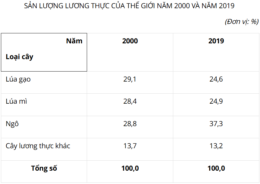 - Tính cơ cấu sản lượng lương thực thế giới năm 2000 và năm 2019.
