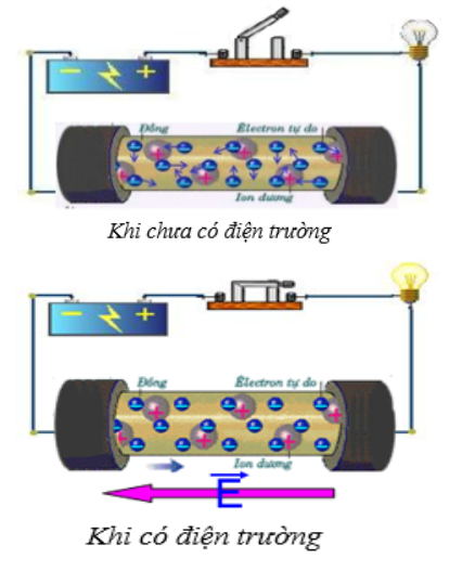- Dòng điện được tạo ra khi điện trường (do nguồn điện ngoài sinh ra) đẩy khí electron trôi ngược chiều điện trường.