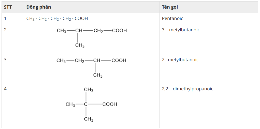 carboxylic acid C5H10O2 có 4 đồng phân cấu tạo, cụ thể: