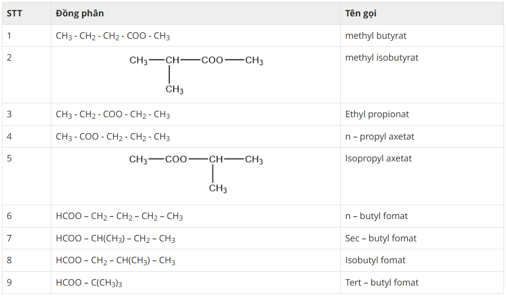 ester C5H10O2 có 9 đồng phân cấu tạo, cụ thể