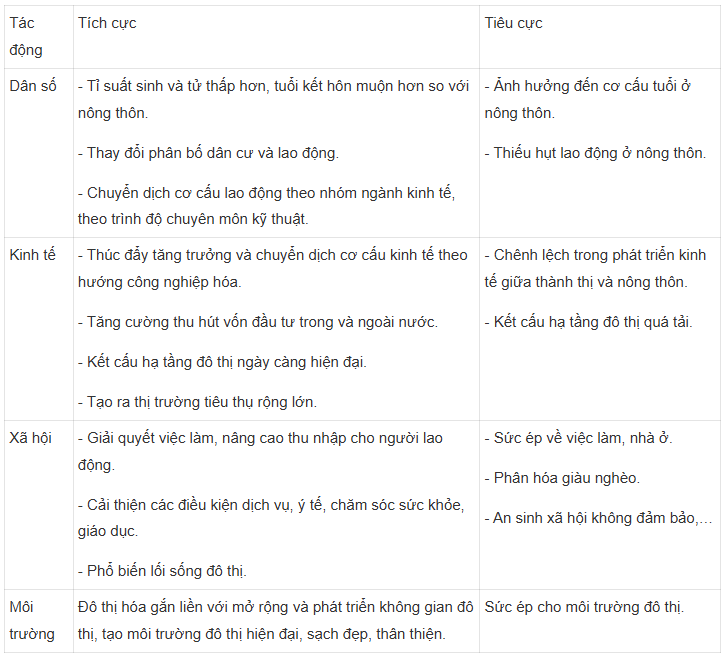 Câu hỏi: Đọc thông tin và quan sát hình 2.6, hãy trình bày những tác động tích cực và tiêu cực của đô thị hóa ở Việt Nam.