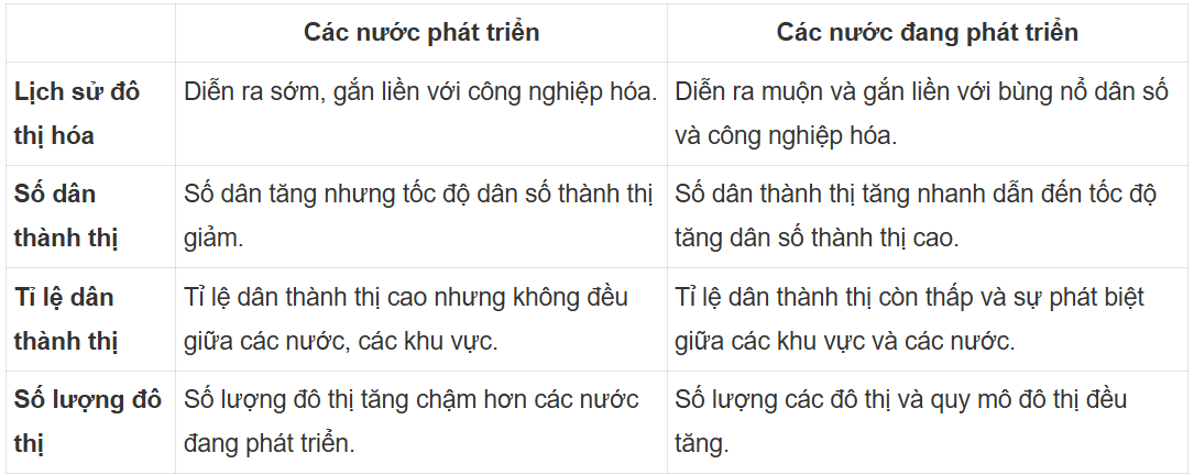 - Đô thị hóa ở các nước phát triển và đang phát triển có đặc điểm khác nhau về số dân thành thị, quá trình phát triển và định hướng trong tương lai.