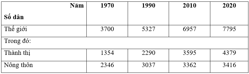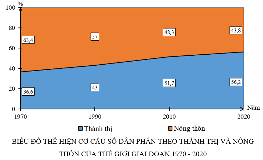 Hãy vẽ biểu đồ miền thể hiện cơ cấu số dân phân theo thành thị và nông thôn của thế giới giai đoạn 1970 – 2020.