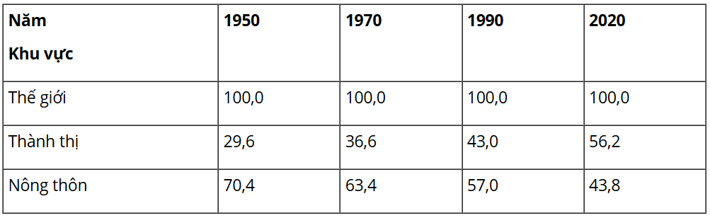 b. Rút ra nhận xét về sự thay đổi cơ cấu dân số phân theo thành thị và nông thôn của thế giới giai đoạn 1950 - 2020.