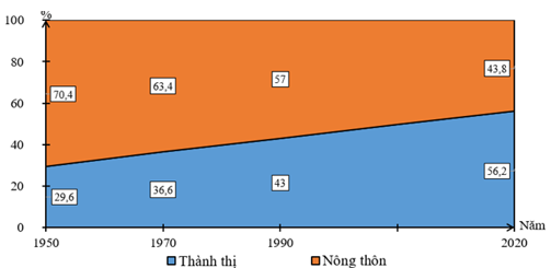 - Tỉ lệ dân nông thôn giảm từ 70,4% năm 1950 xuống còn 43,8% năm 2020, giảm 26,6%. Theo đó là quá trình tăng tỉ lệ dân thành thị, tăng tương đương 26,6%, từ 29,6% (1950) lên 56,2% năm 2020.