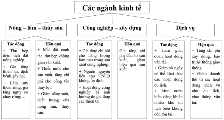 Hệ quả | - Nông nghiệp, lâm nghiệp, thuỷ sản + Mất đất canh tác, thu hẹp không gian sản xuất. + Thiếu nước cho sản xuất, tăng chi phí cho công tác thuỷ lợi. + Giảm năng suất, chất lượng của nông sản, thuỷ sản. - Công nghiệp:gia tăng chi phí đầu tư sản xuất, giảm hiệu quả sản xuất. - Dịch vụ + Tăng chi phí xây dựng, bảo trì hệ thống giao thông. + Giảm doanh thu từ các hoạt động dịch vụ như du lịch, vận tải. | - Cuộc sống của con người trở nên khắc nghiệt và bấp bênh hơn. - Làm suy giảm sức khoẻ con người, dẫn đến tăng nguồn chi cho hệ thống y tế, từ đó ảnh hưởng đến chất lượng lao độn |