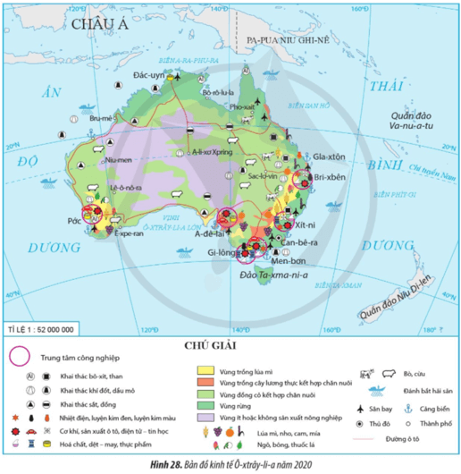 + Nông nghiệp: Ô-xtrây-li-a có nền nông nghiệp phát triển mạnh, lúa mì là cây ngũ cốc hàng đầu, được trồng nhiều ở phía đông nam và tây nam. Các cây trồng quan trọng khác bao gồm: bông, thuốc lá, mía, ngô, nho, cam,… trồng chủ yếu ở các vùng phía nam. Chăn nuôi cừu và bò phát triển mạnh. Cừu được chăn nuôi ở hầu hết các vùng, nhưng có hơn 1/3 tổng đàn cừu được chăn thả hoàn toàn trên đồng cỏ tự nhiên tại các vùng khô hạn của Bắc Ô-xtray-li-a và Quin-len. Hầu hết bò thịt của Ô-xtray-li-a được nuôi ở Quin-len, Bắc Ô-xtray-li-a và Nam xứ Uên.