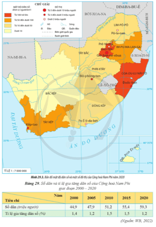Luyện tập 2 SGK Địa Lí 11 Cánh diều Bài 29 (trang 142): Dựa vào bảng 29, hãy nhận xét về dân số và tỉ lệ gia tăng dân số của Cộng hòa Nam Phi giai đoạn 2000 - 2020. Phân tích tác động của dân cư tới phát triển kinh tế - xã hội.