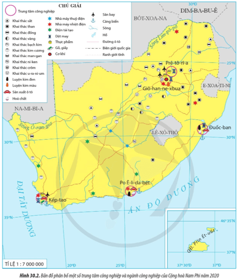 Câu hỏi 1 SGK Địa 11 Cánh diều Bài 30 (trang 145): Đọc thông tin và quan sát hình 30.2, hãy trình bày các đặc điểm nổi bật của ngành công nghiệp Cộng hòa Nam Phi.