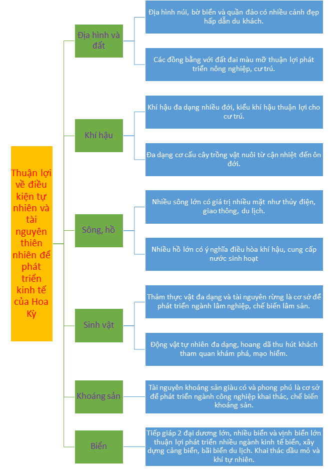 Luyện tập 1: Lập sơ đồ thể hiện những thuận lợi về điều kiện tự nhiên và tài nguyên thiên nhiên để phát triển kinh tế của Hoa Kỳ