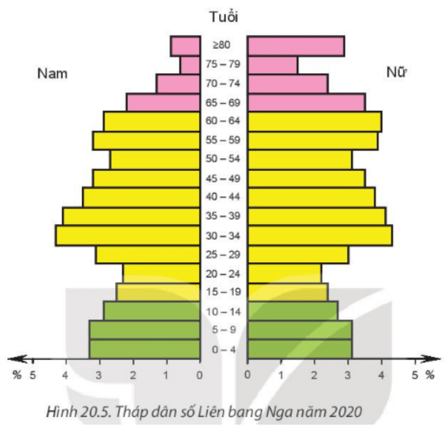 Luyện tập 2: Dựa vào hình 20.5, hãy phân tích cơ cấu giới tính và tuổi của dân số Liên Bang Nga năm 2020. Nêu ảnh hưởng của cơ cấu dân số đó đối với sự phát triển kinh tế - xã hội của Liên Bang Nga.