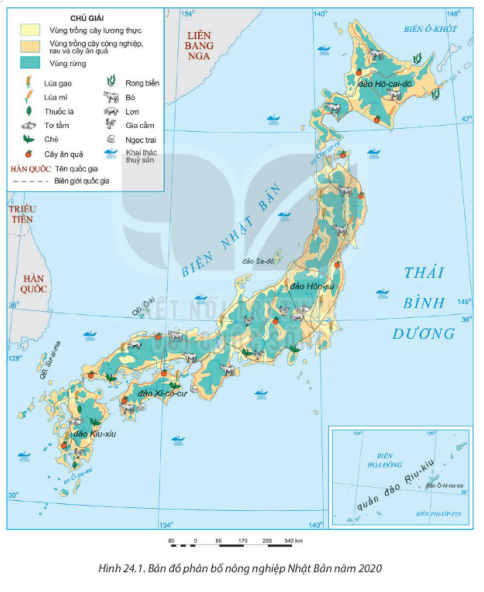 Câu hỏi: Dựa vào thông tin mục 1 và hình 24.1, hãy trình bày sự phát triển và phân bố của ngành nông nghiệp, lâm nghiệp và thủy sản Nhật Bản.