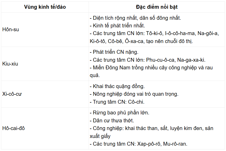 Câu hỏi: Dựa vào thông tin mục III, hãy so sánh đặc điểm nổi bật của các vùng kinh tế Nhật Bản.