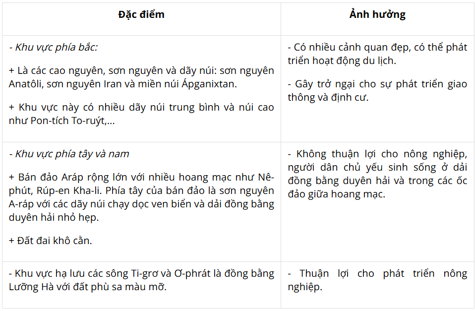 + Phía tây nam là sơn nguyên A-rap chiếm gần toàn bộ diện tích của bán đảo A-rap. Ở giữa là đồng bằng Lưỡng Hà được phù sa của hai sông Ti-grơ và Ơ-phrát bồi đắp.