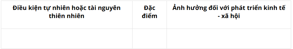Luyện tập 1 SGK Địa Lí 11 Chân trời sáng tạo Bài 17 (trang 92): Lựa chọn một điều kiện tự nhiên hoặc tài nguyên thiên nhiên của Hoa Kỳ và hoàn thành nội dung theo bảng.