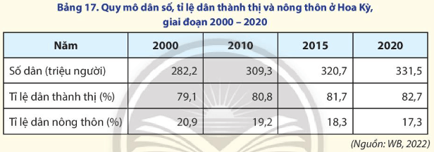 - Hoa Kỳ có tỉ lệ dân thành thị là 82,7% (Năm 2020), một số thành phố đông dân là New York, Los Angeles, Chicago,…