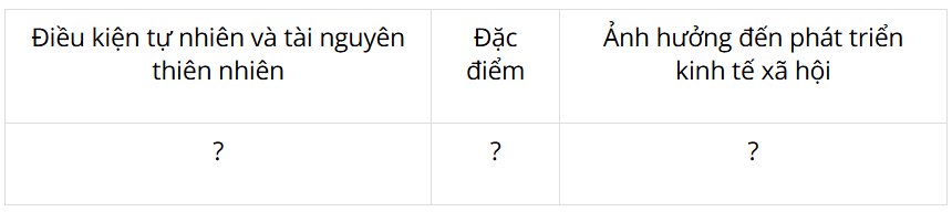 Luyện tập 1: Lựa chọn một điều kiện tự nhiên hoặc tài nguyên thiên nhiên và hoàn thành thông tin theo bảng sau.