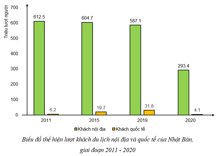 a) Vẽ biểu đồ thể hiện lượt khách du lịch nội địa và quốc tế của Nhật Bản, giai đoan 2011-2020.