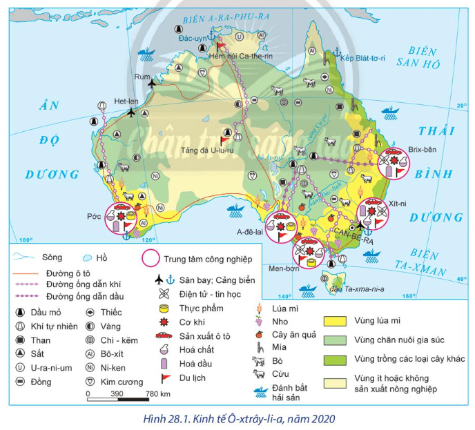 - Sự phân bố của một số sản phẩm ngành trông trọt, ngành chăn nuôi, ngành đánh bắt hải sản của Ô-xtray-li-a.: Chủ yếu ở ven dọc duyên hải biển Thái Bình Dương với các sản phẩm chủ yếu như lúa mì, cây ăn quả, nho, bò,..