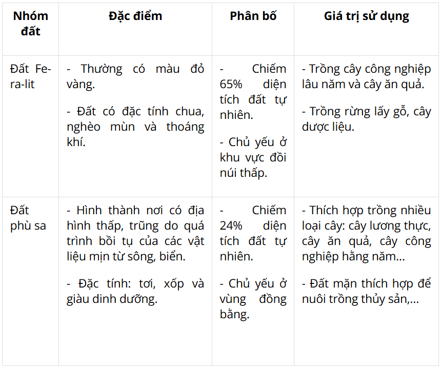+ Trong đó, có 3 loại đất chính: Đất Fe-ra-lit, đất phù sa và đất mùn núi cao. Đây là các loại đất có vai trò đặc biệt quan trọng trong ngành nông nghiệp như: trồng rừng, trồng trọt và nơi cư trú cho con người.
