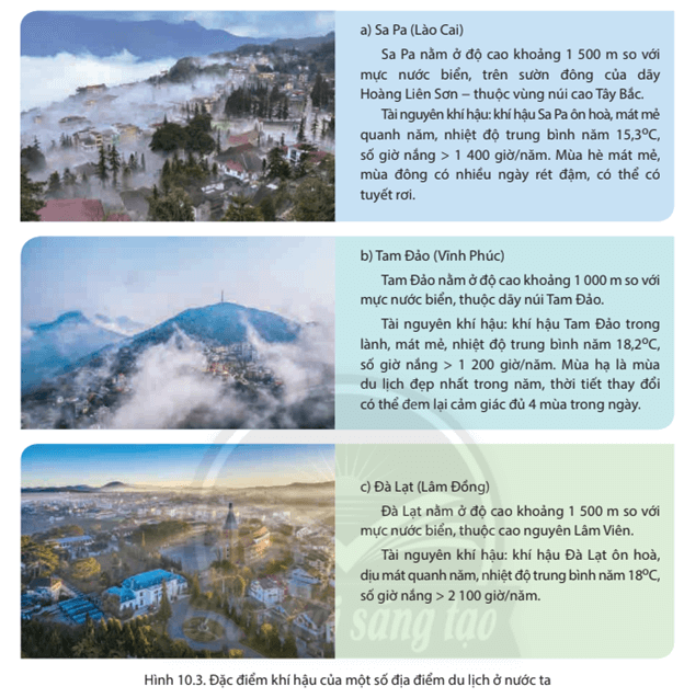 Câu hỏi SGK Địa lí 8 Chân trời sáng tạo Bài 10 (trang 128): Dựa vào hình 10.3 và thông tin trong bài, em hãy phân tích vai trò của khí hậu đối với sự phát triển du lịch ở một số điểm du lịch nổi tiếng của nước ta.