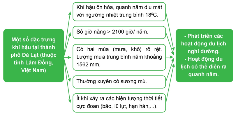 => Với những đặc điểm khí hậu thú vị như vậy, nên các hoạt động du lịch nghỉ dưỡng rất phát triển ở Đà Lạt, thu hút du khách trong và ngoài nước đến tham quan, trải nghiệm.