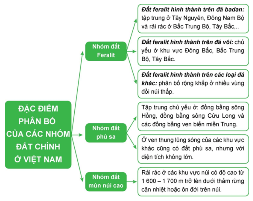 Câu hỏi 2 SGK Địa lí 8 Chân trời sáng tạo Bài 11 (trang 133): Lập sơ đồ thể hiện đặc điểm phân bố 3 nhóm đất chính của nước ta