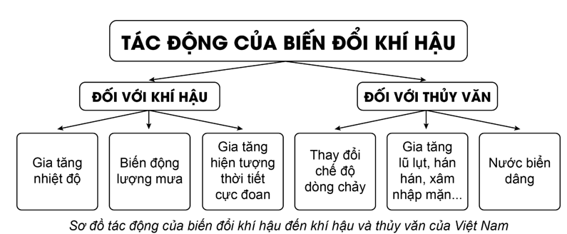 Câu hỏi: Vẽ sơ đồ thể hiện tác động của biến đổi khí hậu đến khí hậu và thủy văn Việt Nam