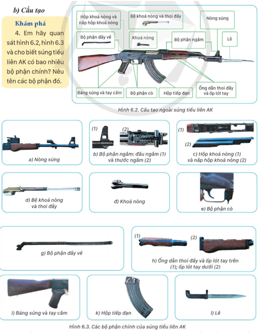 Khám phá 4 SGK Giáo dục Quốc phòng 11 Cánh diều Bài 6 (trang 39): Em hãy quan sát hình 6.2, hình 6.3 và cho biết súng tiểu liên AK có bao nhiêu bộ phận chính? Nêu tên các bộ phận đó.