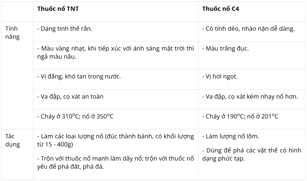 Khám phá 8 SGK Giáo dục Quốc phòng 11 Cánh diều Bài 6 (trang 45): Em hãy so sánh tính năng, tác dụng của thuốc nổ TNT và thuốc nổ C4