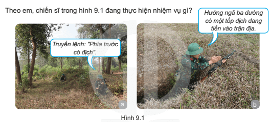- Hình 9.1 là hình ảnh chiến sĩ trinh sát đang thông báo, truyền lệnh, thông tin cho đồng đội ở tuyến sau trong quá trình chiến đấu