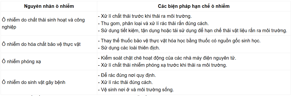 Bài tập 2: Nêu các biện pháp hạn chế ô nhiễm môi trường theo mẫu bảng sau: