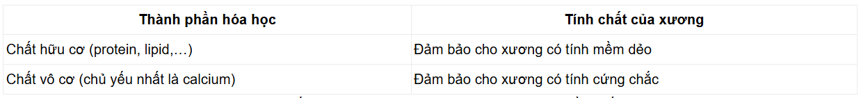 - Xương có khả năng chịu lực và bền chắc là nhờ xương được cấu tạo từ các chất vô cơ và chất hữu cơ. Trong đó, các chất hữu cơ cấu tạo nên xương gồm protein (chủ yếu là collagen), lipid và saccharide đảm bảo cho xương có tính mềm dẻo; các chất vô cơ cấu tạo nên xương chủ yếu là muối calcium, muối phosphate đảm bảo cho xương có tính cứng chắc.