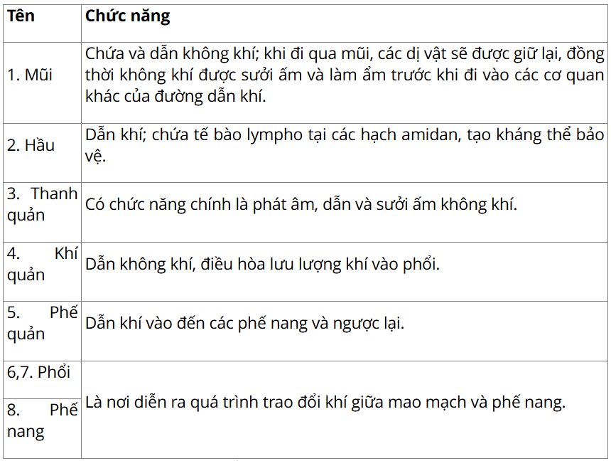 - Chức năng của hệ hô hấp trong cơ thể là thực hiện trao đổi khí giữa cơ thể với môi trường.