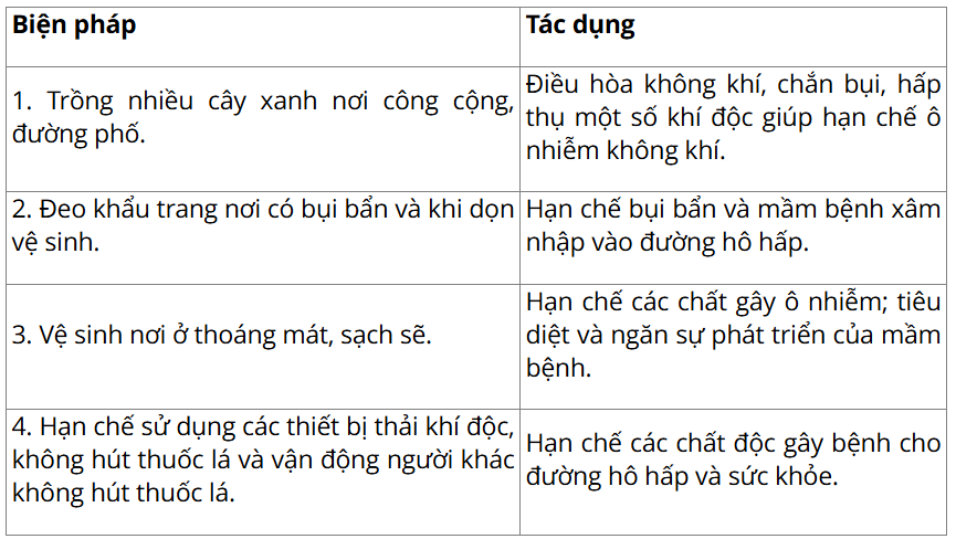 Câu hỏi 7 SGK Khoa học tự nhiên 8 Chân trời sáng tạo Bài 37 (trang 164): Xác định tác dụng của một số biện pháp phòng, chống ô nhiễm không khí cho đường hô hấp bằng cách hoàn thành bảng như mẫu bên.