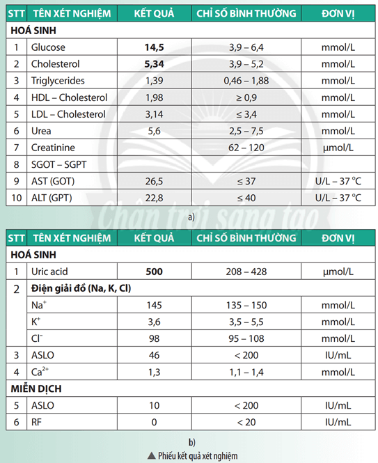 Vận dụng SGK Khoa học tự nhiên 8 Chân trời sáng tạo Bài 40 (trang 175): Một bệnh nhân tiểu đường và một bệnh nhân Gout có kết quả xét nghiệm máu như phiếu a, b dưới đây. Hãy nhận xét về chỉ số glucose, chỉ số uric acid trên phiếu kết quả xét nghiệm của hai bệnh nhân này so với chỉ số bình thường.