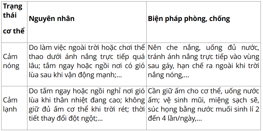 Câu hỏi 6 SGK Khoa học tự nhiên 8 Chân trời sáng tạo Bài 43 (trang 189): Trình bày nguyên nhân và biện pháp chống cảm nóng, cảm lạnh bằng cách hoàn thành bảng sau: