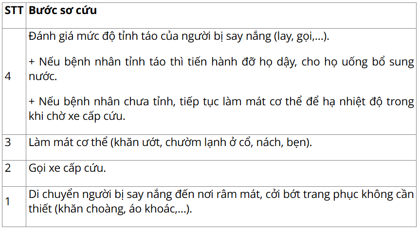 Câu hỏi 7 SGK Khoa học tự nhiên 8 Chân trời sáng tạo Bài 43 (trang 189): Hãy sắp xếp thứ tự ưu tiên khi tiến hành sơ cứu cho người bị say nắng.