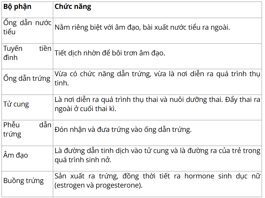 - Hệ sinh dục nữ có chức năng sản xuất trứng; là nơi diễn ra quá trình thụ tinh, thụ thai, nuôi dưỡng thai và sinh con; sản xuất hormone điều hòa quá trình sinh trứng.