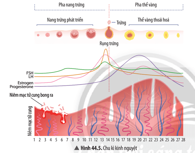 Vận dụng SGK Khoa học tự nhiên 8 Chân trời sáng tạo Bài 44 (trang 194): Dựa vào Hình 44.5, cho biết nếu sử dụng thuốc tránh thai thì có xảy ra hiện tượng kinh nguyệt không. Giải thích.