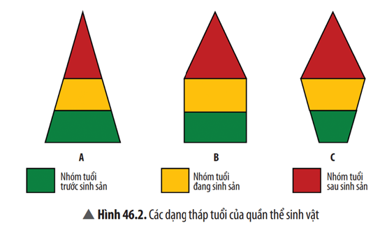 Ổn định | B | Do tháp này có số lượng cá thể ở nhóm tuổi trước sinh sản và sinh sản bằng nhau → quần thể có xu hướng giữ ổn định kích thước quần thể. |
