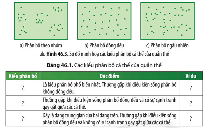 Câu hỏi 5: Quan sát Hình 46.3, hãy xác định đặc điểm tương ứng của mỗi kiểu phân bố cá thể bằng cách hoàn thành Bảng 46.1.