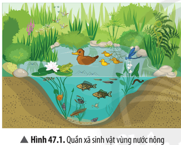 a) Các quần thể có trong quần xã sinh vật vùng nước nông trong hình: Quần thể vịt, quần thể cá, quần thể chuồn chuồn, quần thể ốc, quần thể hoa sen, quần thể bọ nước, quần thể rau mũi mác,…
