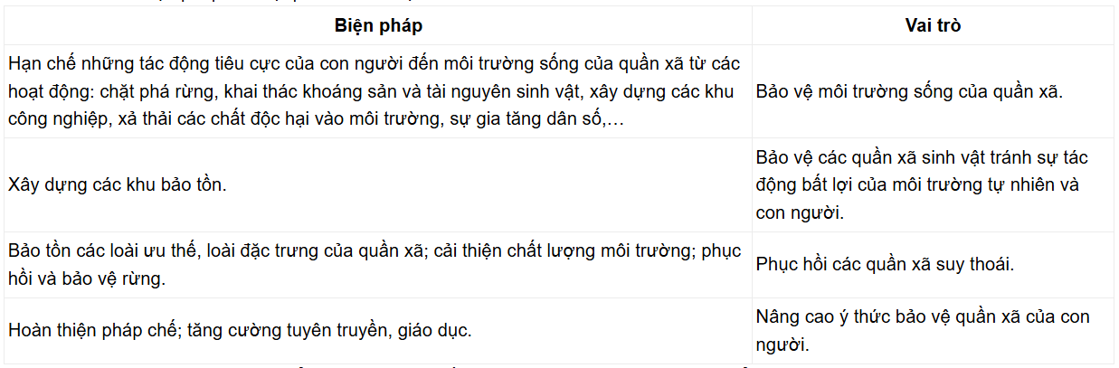 Câu hỏi 4: Cho biết vai trò của các biện pháp bảo vệ quần xã sinh vật.
