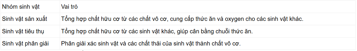 b) Các nhóm sinh vật có trong quần xã và vai trò của các nhóm sinh vật đó: