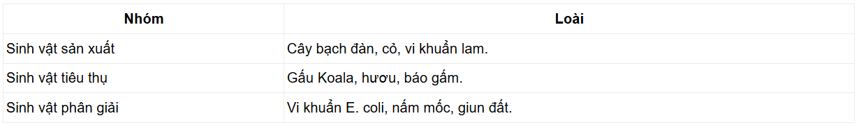 Luyện tập 2: Cho các sinh vật sau: cây bạch đàn, gấu Koala, vi khuẩn E.coli, nấm mốc, hươu, cỏ, báo gấm, vi khuẩn lam, giun đất. Hãy sắp xếp các loài trên vào mỗi nhóm trong bảng sau cho phù hợp.
