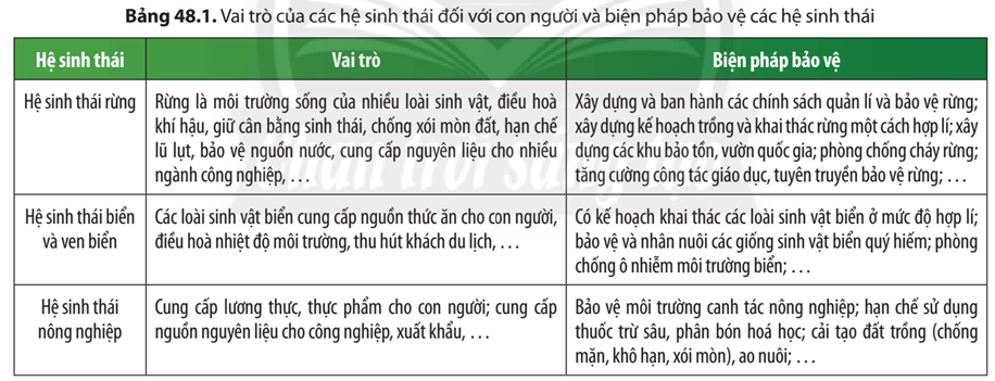 Câu hỏi 6: Tìm hiểu thông tin từ Bảng 48.1, em hãy cho biết tầm quan trọng của việc bảo vệ các hệ sinh thái.
